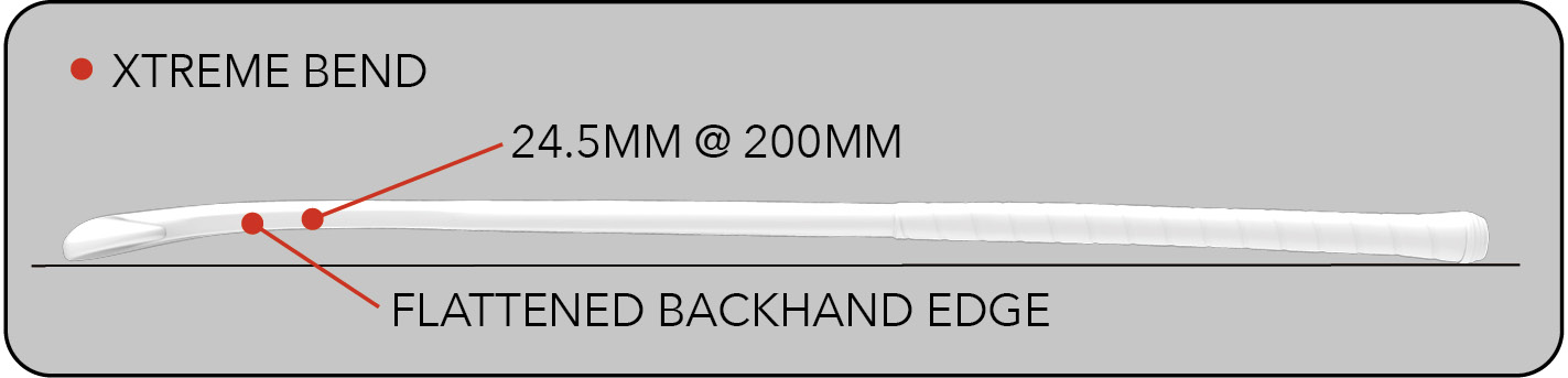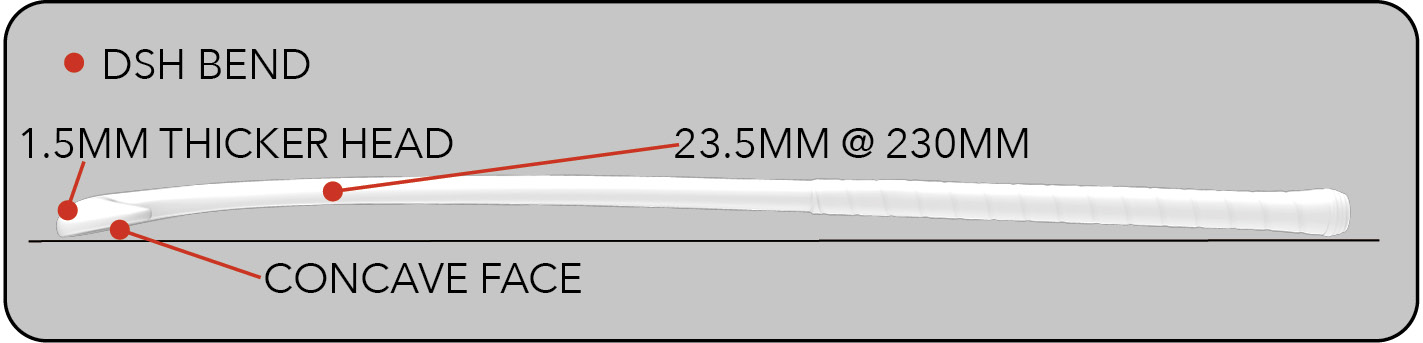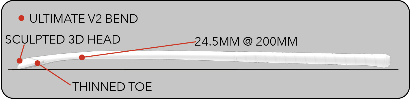 The concave face shape ‘cups’ and cushions the ball to help with close control, 3D skill execution and lifted passes but is obviously within the FIH 4mm deviation guidelines. To create the concave face the head is 2mm thicker than the Ultimate bend and therefore also offers a head weighted bias which aids hitting and slapping power.