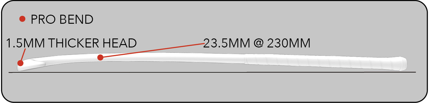The Mercian Pro Bend incorporates a near maximum 23.5mm bow positioned just below the mid-point of the shaft, approximately 230mm from the bottom of the stick. The shaft has then been shaped to give a thinner profile under the right hand and a balance point that favours the head end of the stick. This gives a combination of great stick turn-over due to the shape but enhanced hitting power because of the balance point and sweet spot, the hitting power is also enhanced because the head is 1.5mm thicker than the Ultimate bend.